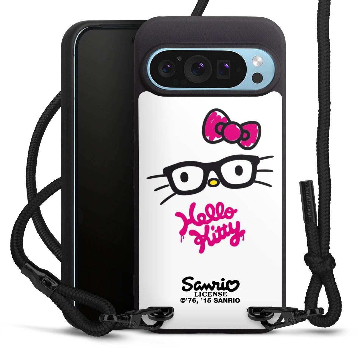Pure Black: Handyhülle, Stoffband und Metalldetails in stylischem Mattschwarz.