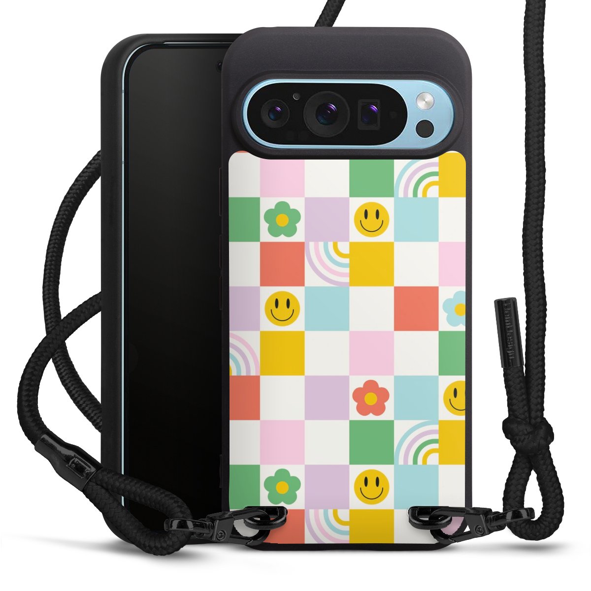 Pure Black: Handyhülle, Stoffband und Metalldetails in stylischem Mattschwarz.