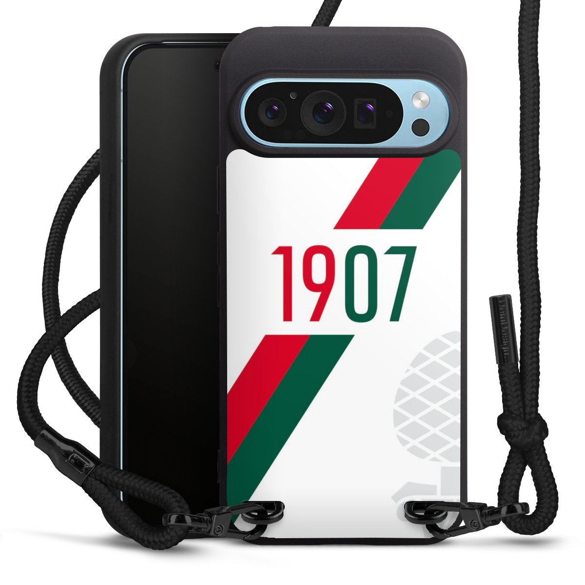 Pure Black: Handyhülle, Stoffband und Metalldetails in stylischem Mattschwarz.
