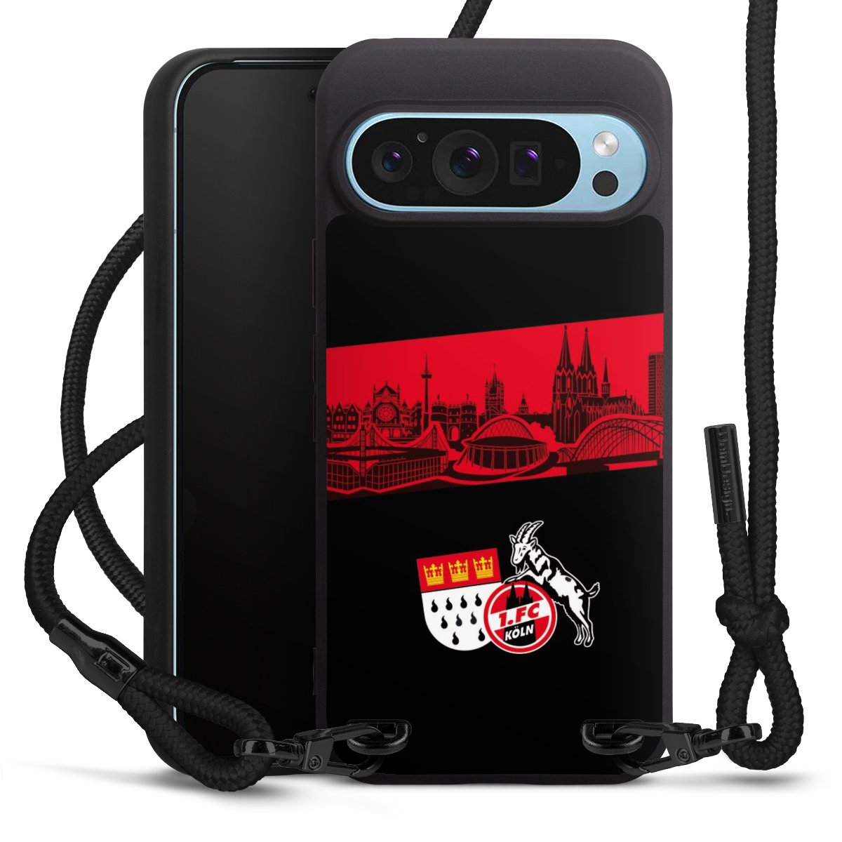 Pure Black: Handyhülle, Stoffband und Metalldetails in stylischem Mattschwarz.