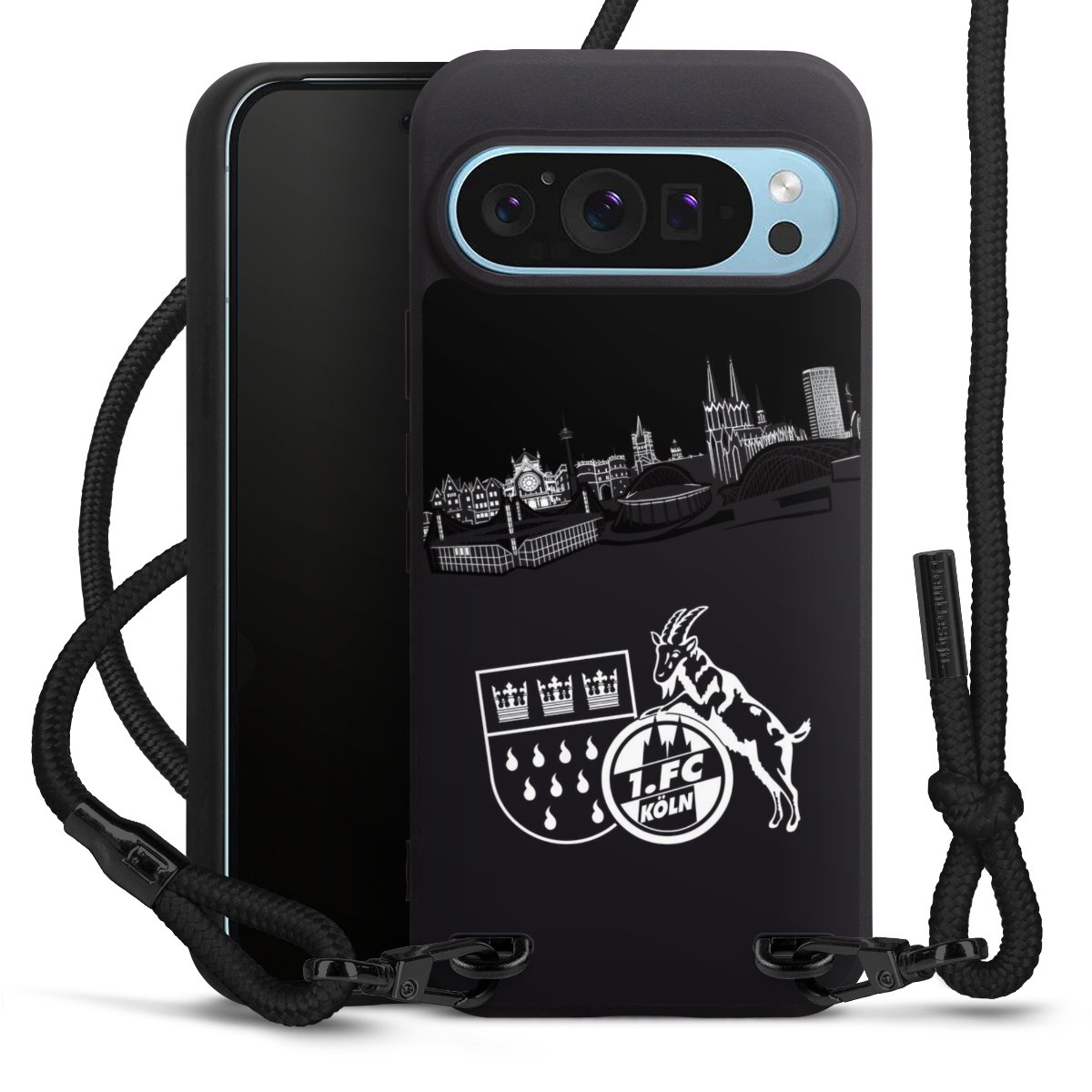 Pure Black: Handyhülle, Stoffband und Metalldetails in stylischem Mattschwarz.