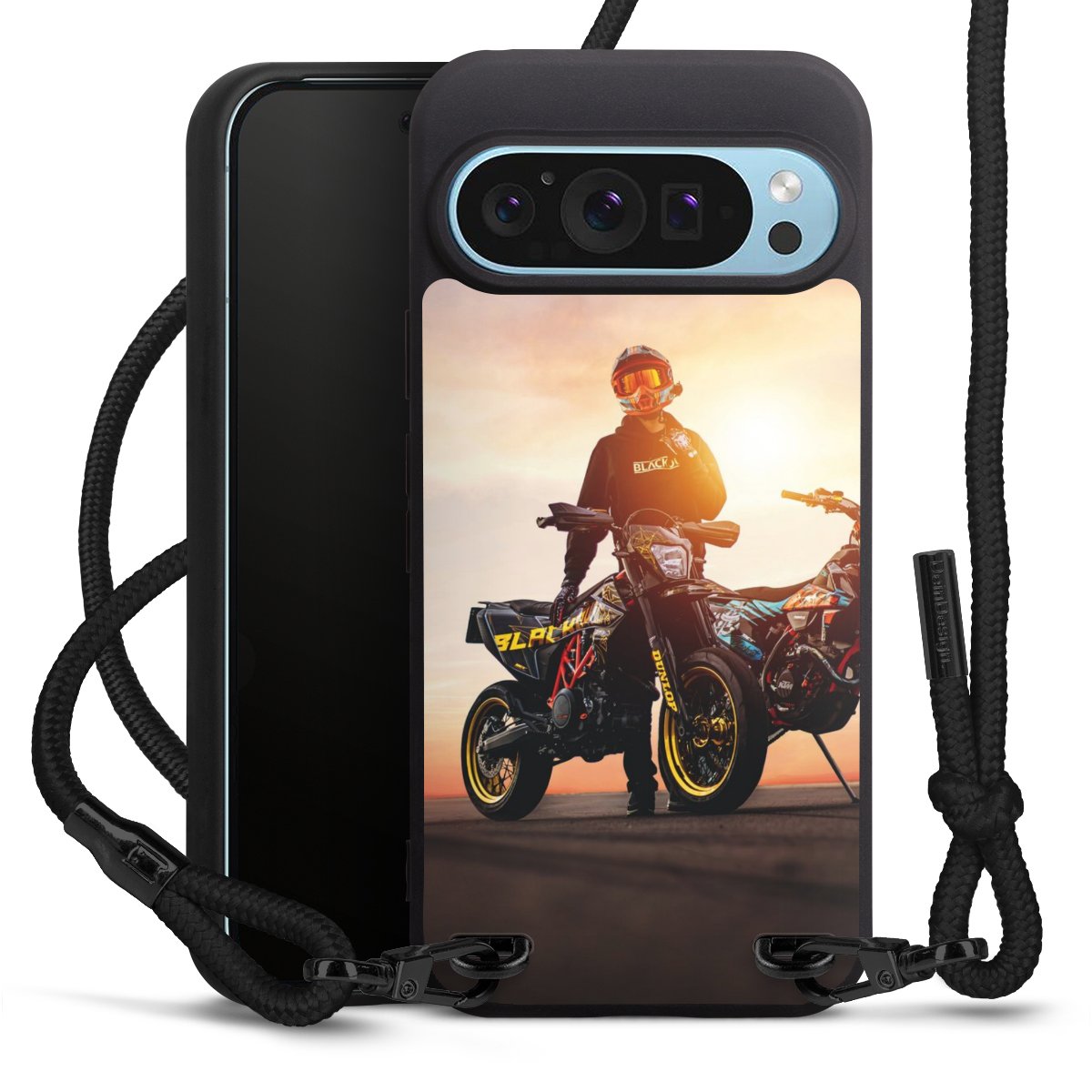Pure Black: Handyhülle, Stoffband und Metalldetails in stylischem Mattschwarz.