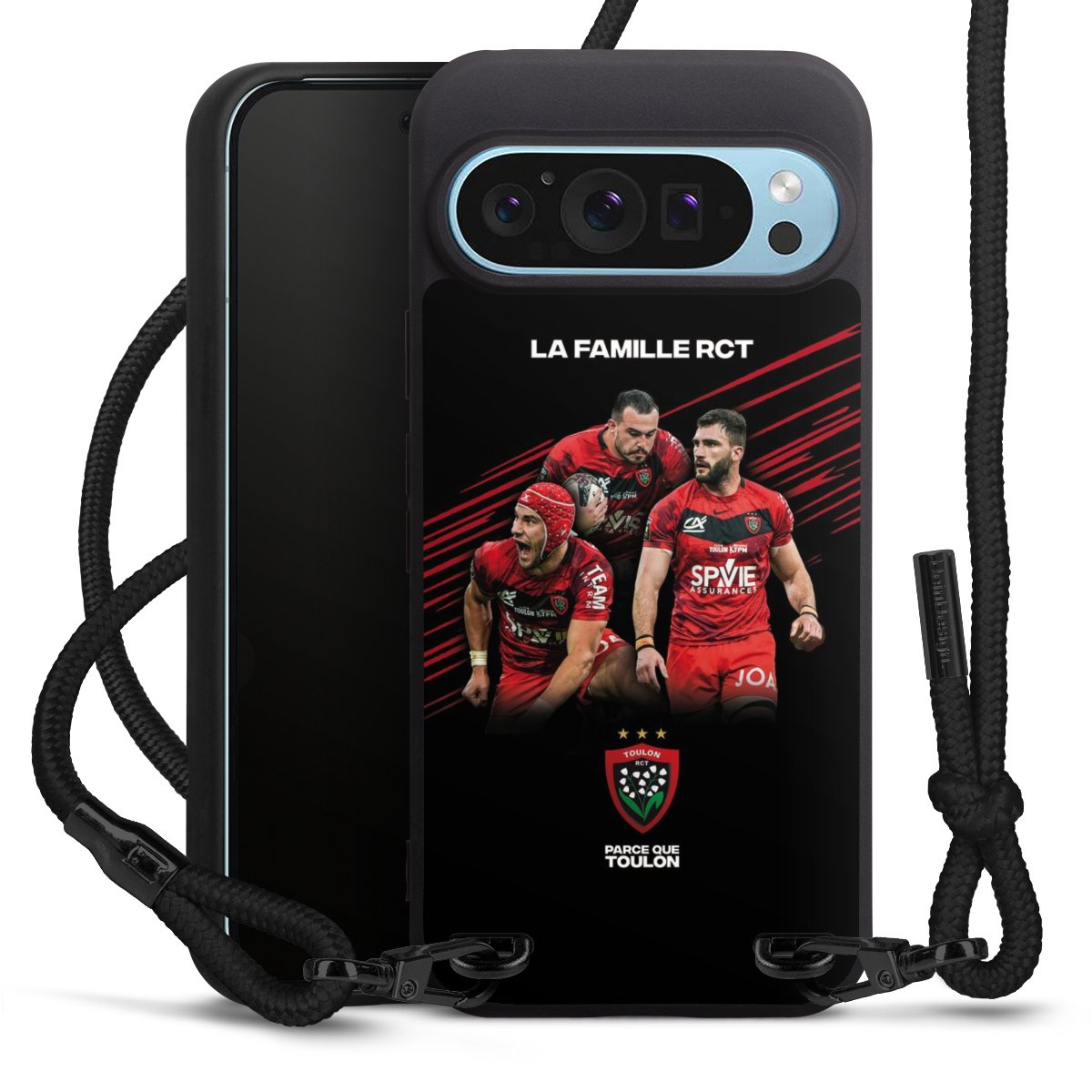 Pure Black: Handyhülle, Stoffband und Metalldetails in stylischem Mattschwarz.