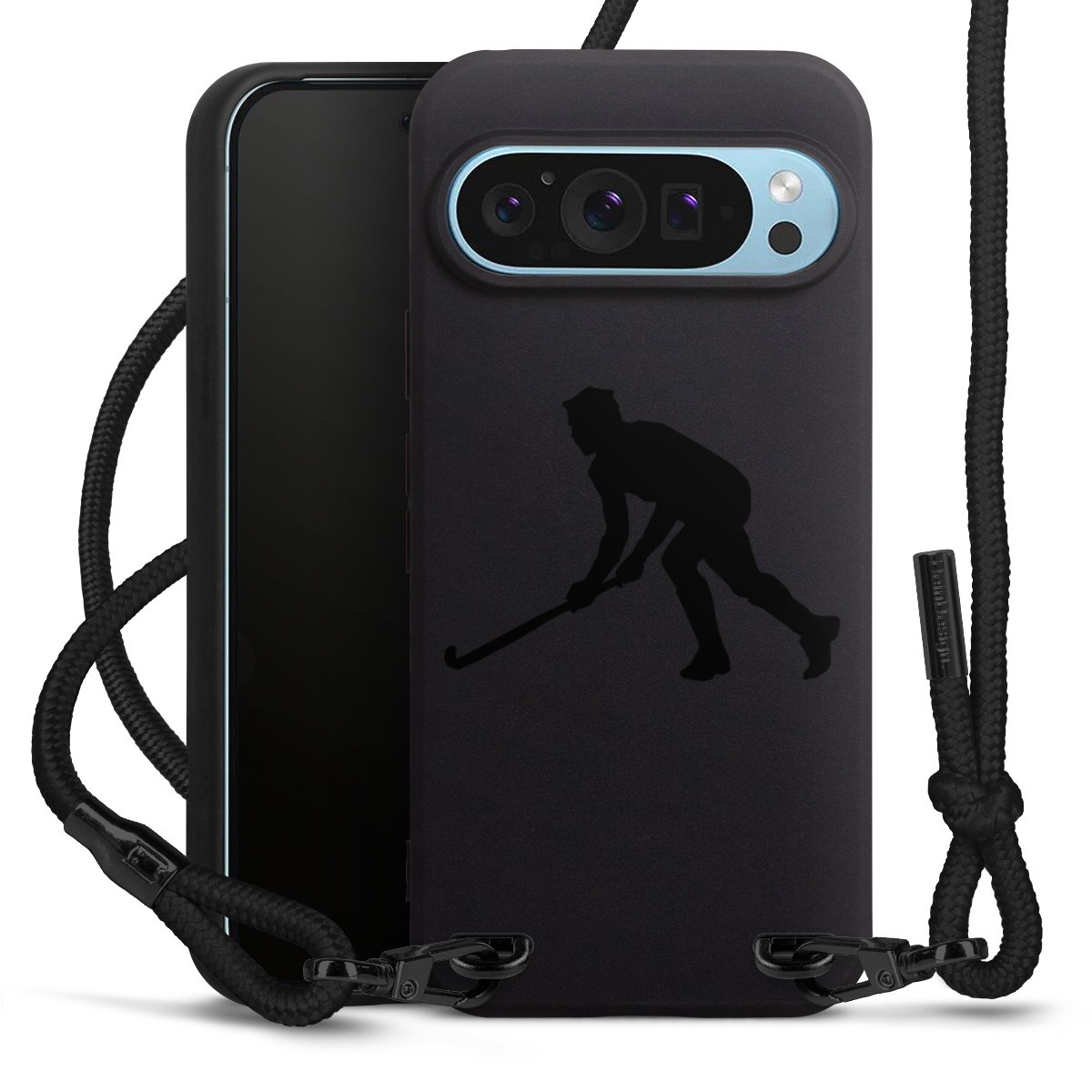 Pure Black: Handyhülle, Stoffband und Metalldetails in stylischem Mattschwarz.