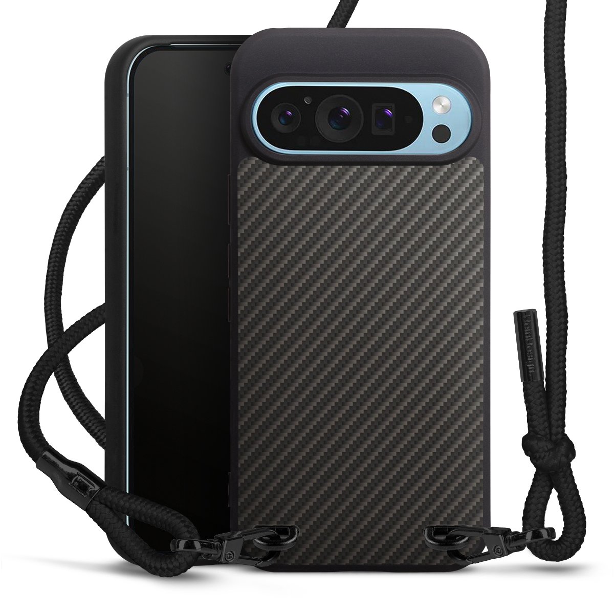 Pure Black: Handyhülle, Stoffband und Metalldetails in stylischem Mattschwarz.