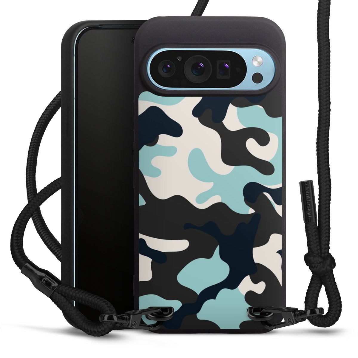 Pure Black: Handyhülle, Stoffband und Metalldetails in stylischem Mattschwarz.