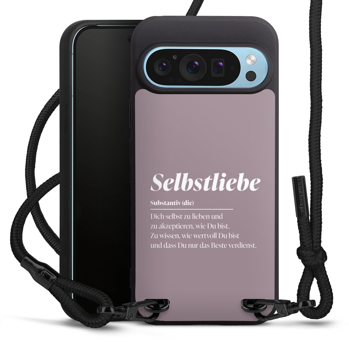 Pure Black: Handyhülle, Stoffband und Metalldetails in stylischem Mattschwarz.