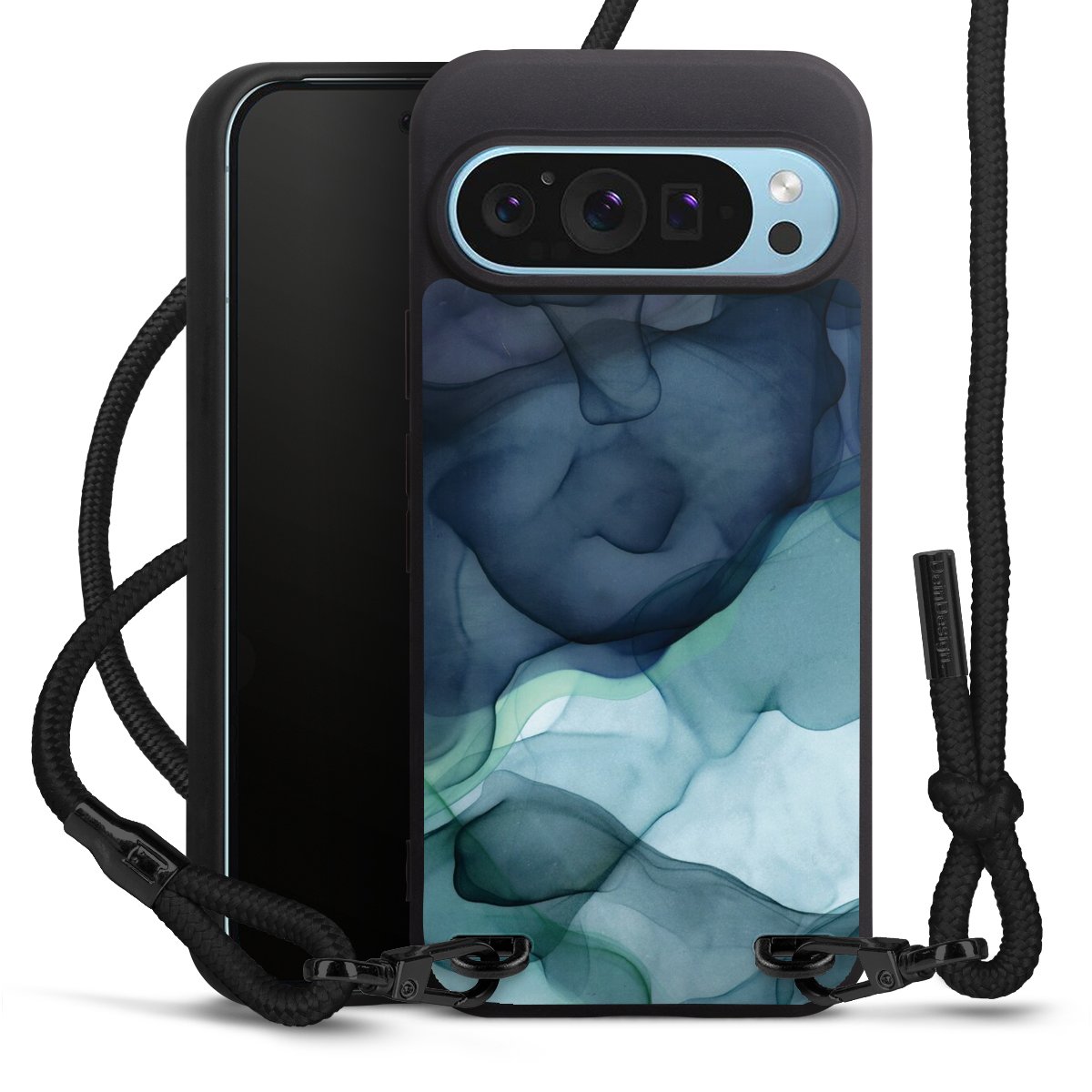 Pure Black: Handyhülle, Stoffband und Metalldetails in stylischem Mattschwarz.