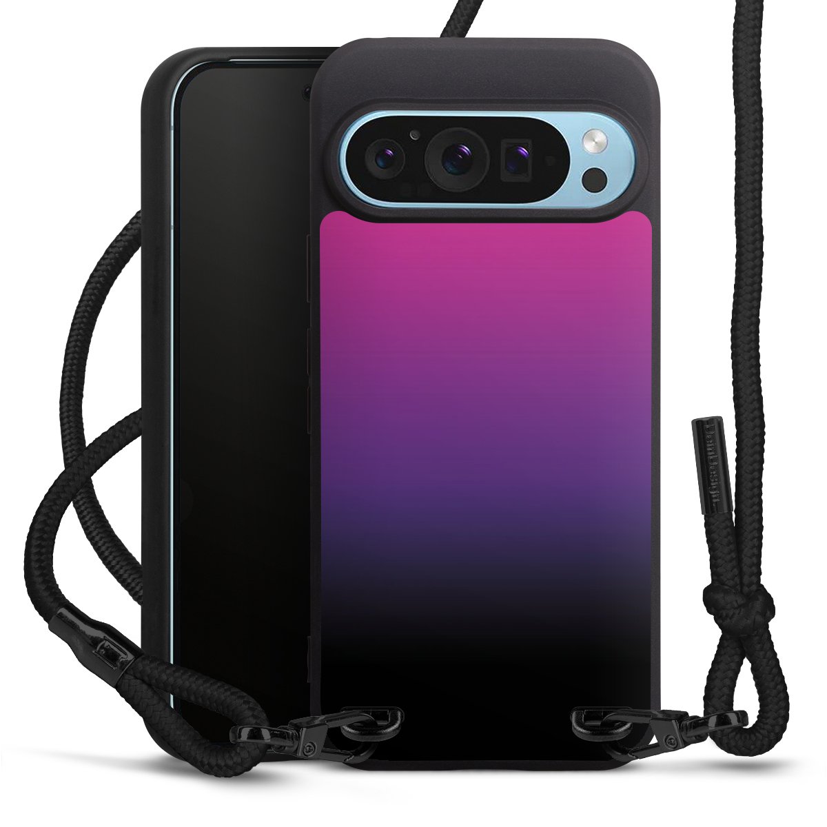 Pure Black: Handyhülle, Stoffband und Metalldetails in stylischem Mattschwarz.