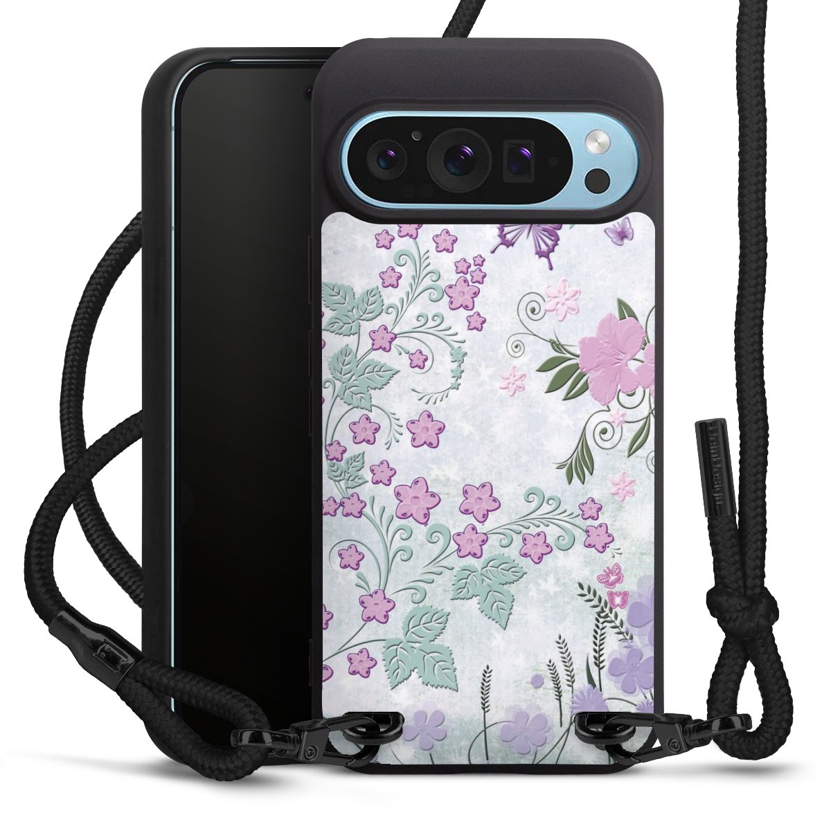 Pure Black: Handyhülle, Stoffband und Metalldetails in stylischem Mattschwarz.