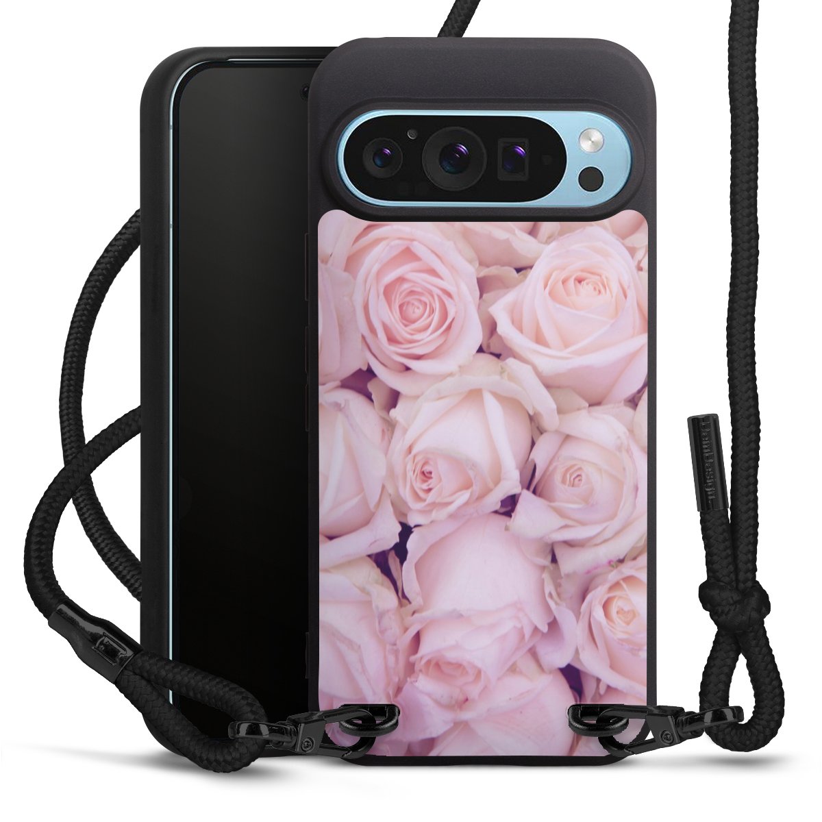 Pure Black: Handyhülle, Stoffband und Metalldetails in stylischem Mattschwarz.