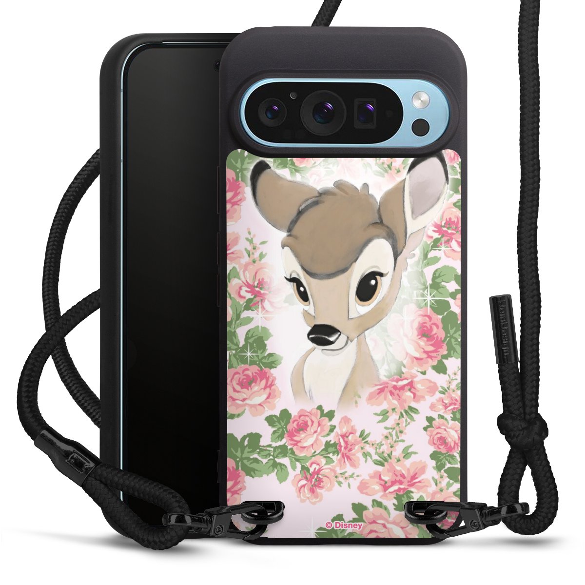 Pure Black: Handyhülle, Stoffband und Metalldetails in stylischem Mattschwarz.