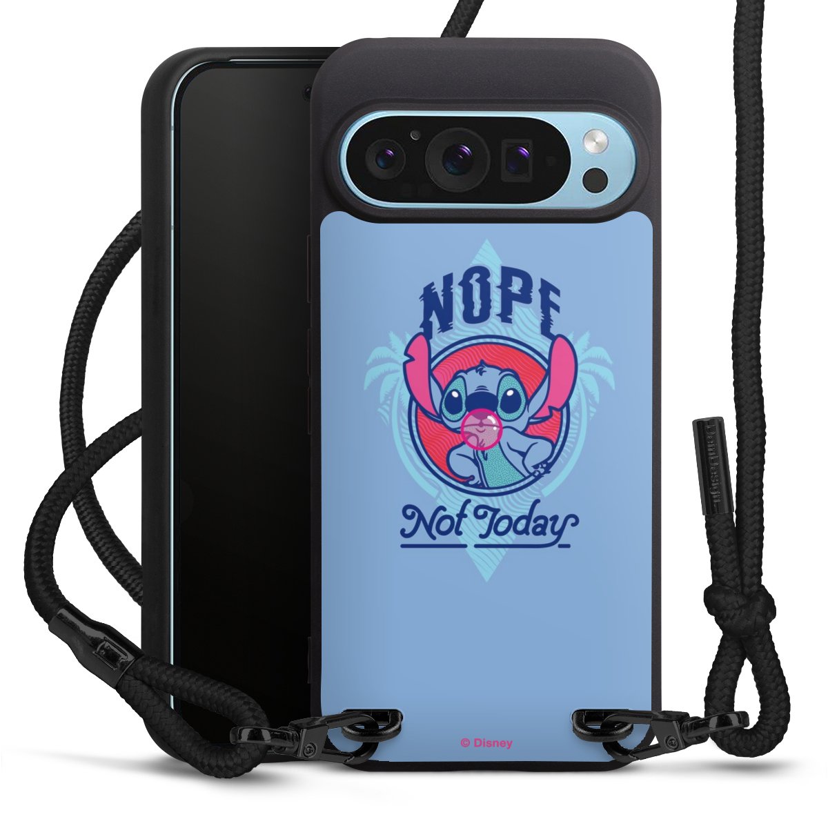 Pure Black: Handyhülle, Stoffband und Metalldetails in stylischem Mattschwarz.