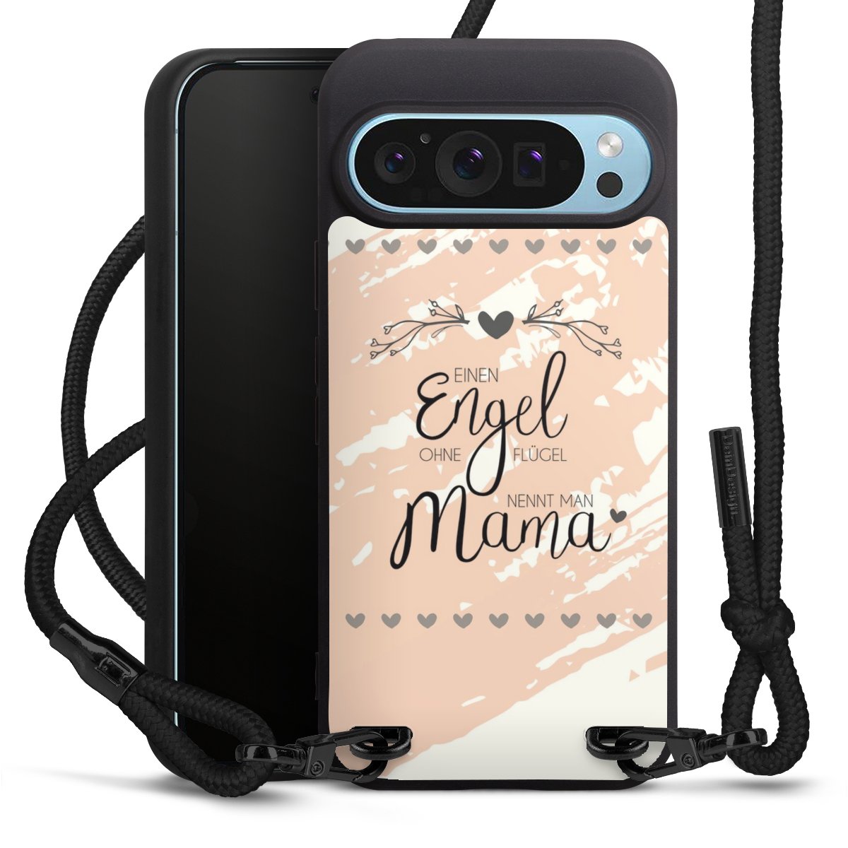 Pure Black: Handyhülle, Stoffband und Metalldetails in stylischem Mattschwarz.