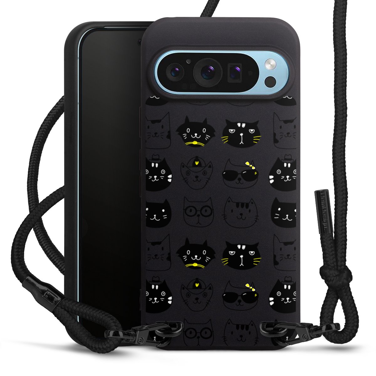 Pure Black: Handyhülle, Stoffband und Metalldetails in stylischem Mattschwarz.