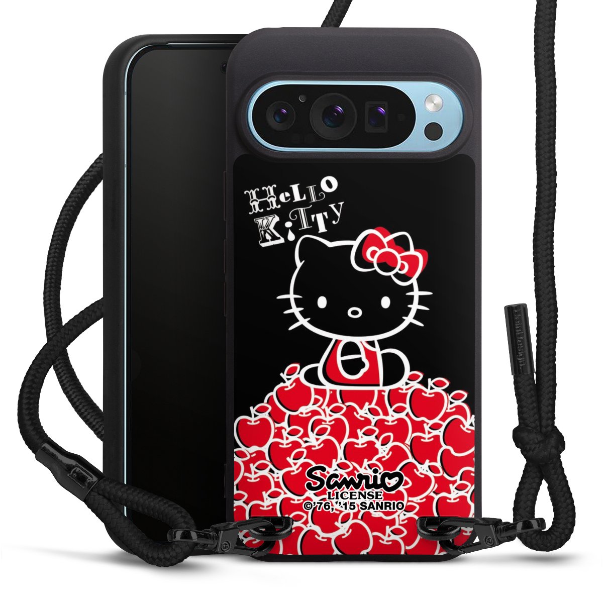 Pure Black: Handyhülle, Stoffband und Metalldetails in stylischem Mattschwarz.