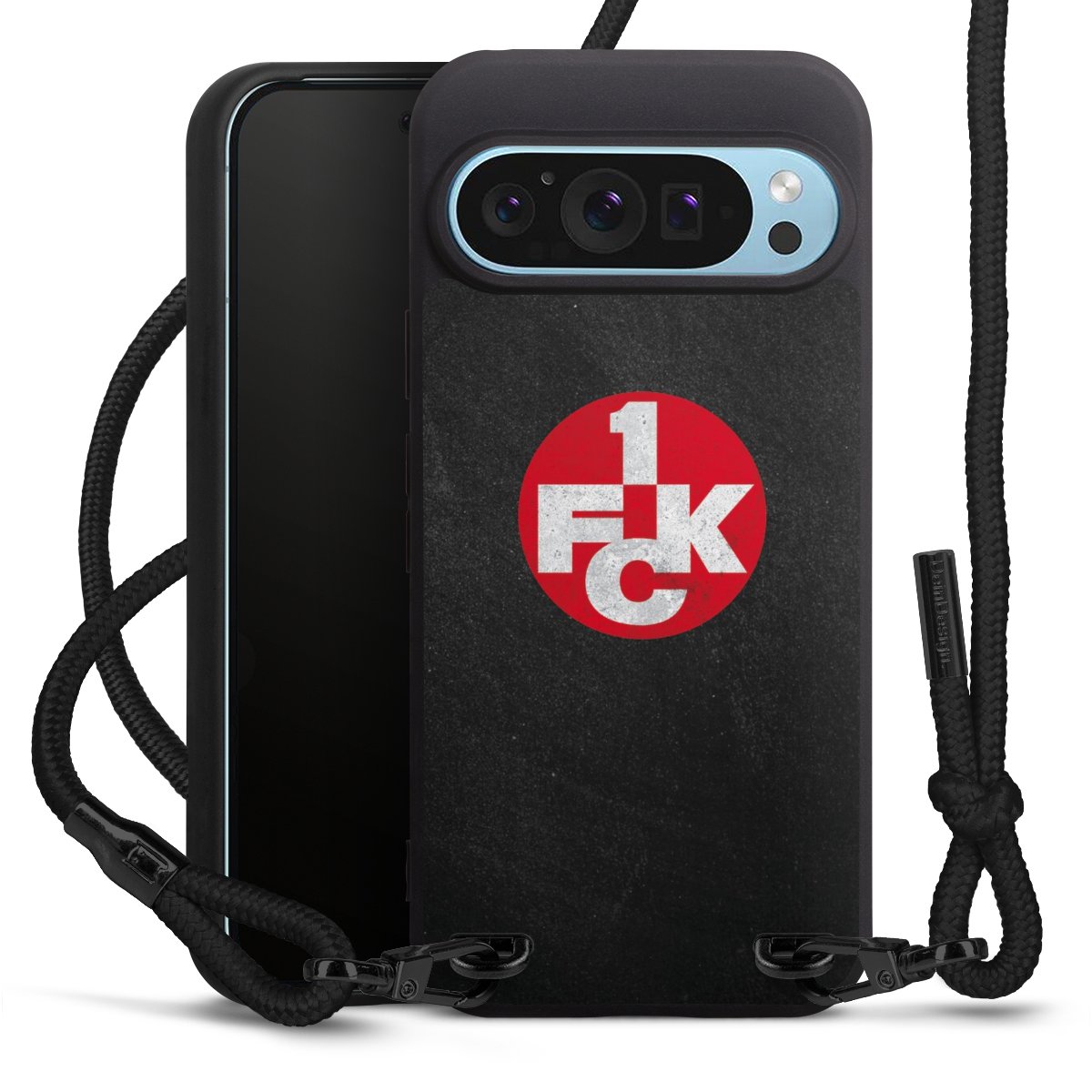 Pure Black: Handyhülle, Stoffband und Metalldetails in stylischem Mattschwarz.