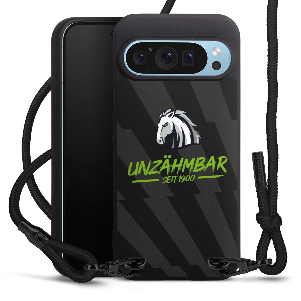 Pure Black: Handyhülle, Stoffband und Metalldetails in stylischem Mattschwarz.