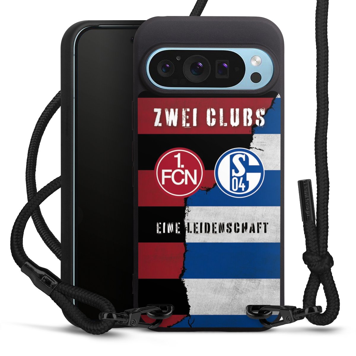 Pure Black: Handyhülle, Stoffband und Metalldetails in stylischem Mattschwarz.
