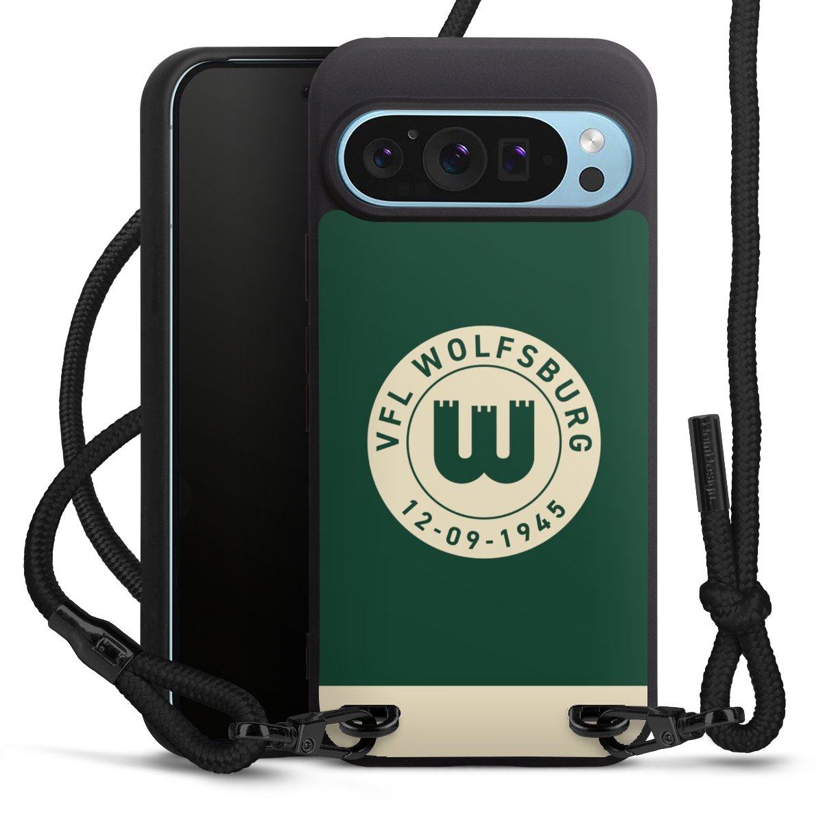Pure Black: Handyhülle, Stoffband und Metalldetails in stylischem Mattschwarz.