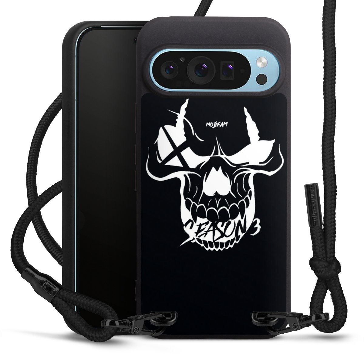 Pure Black: Handyhülle, Stoffband und Metalldetails in stylischem Mattschwarz.