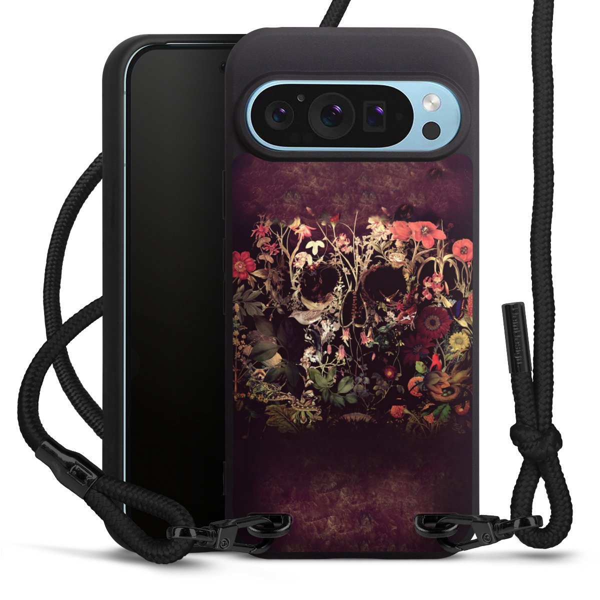 Pure Black: Handyhülle, Stoffband und Metalldetails in stylischem Mattschwarz.