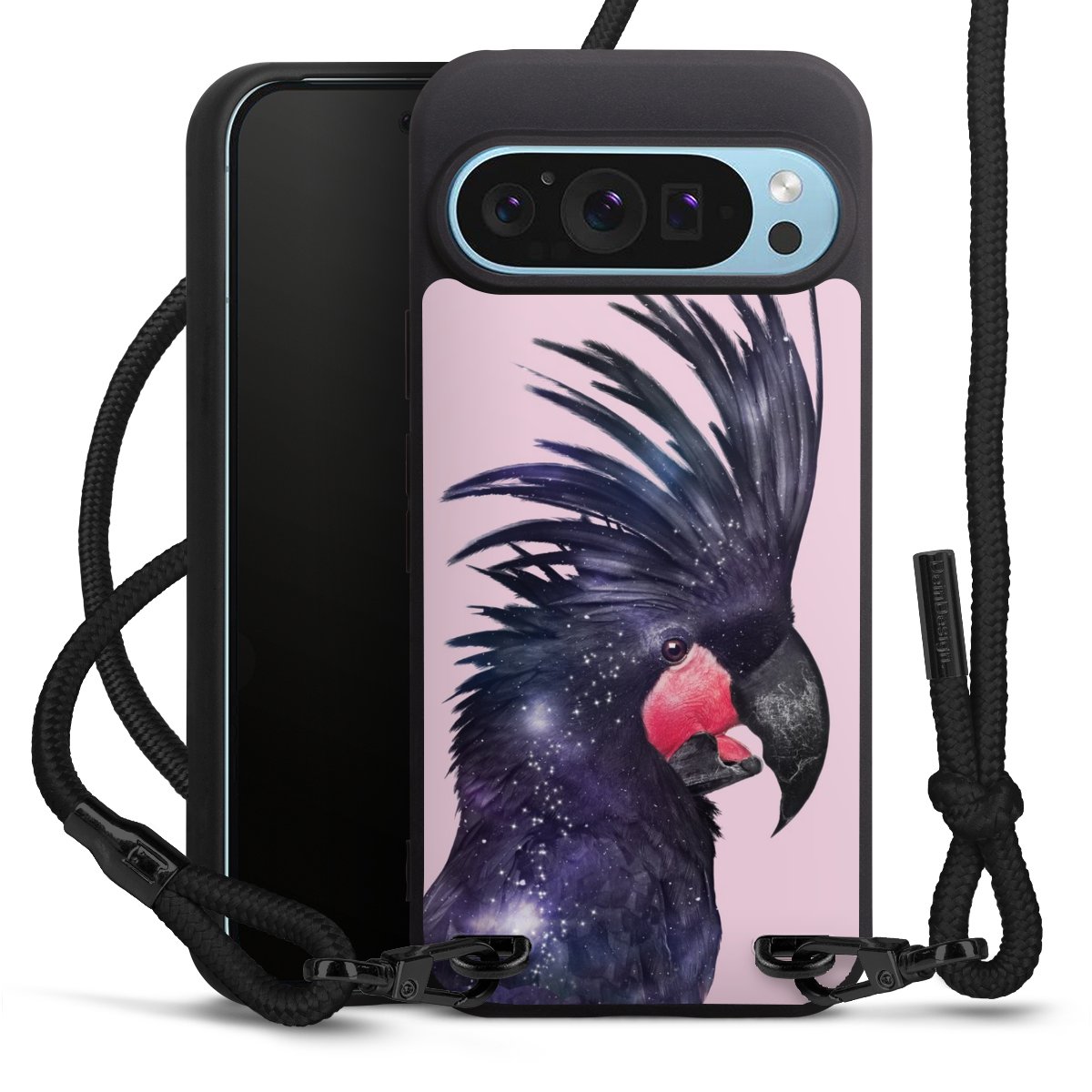 Pure Black: Handyhülle, Stoffband und Metalldetails in stylischem Mattschwarz.