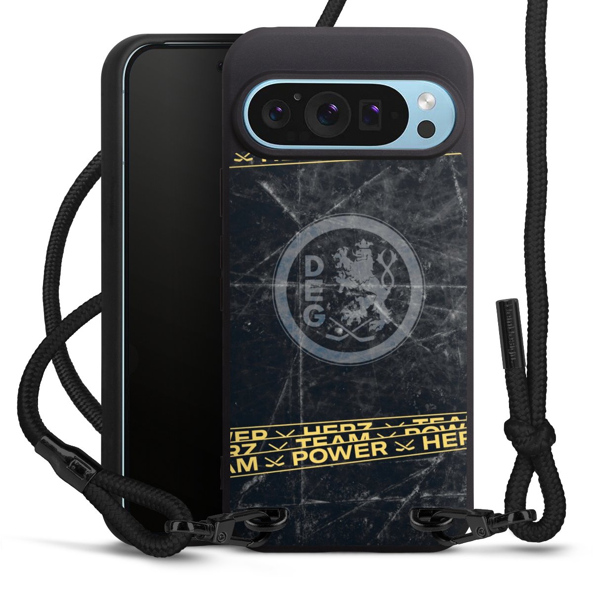 Pure Black: Handyhülle, Stoffband und Metalldetails in stylischem Mattschwarz.