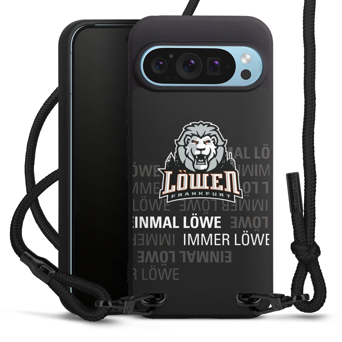 Pure Black: Handyhülle, Stoffband und Metalldetails in stylischem Mattschwarz.