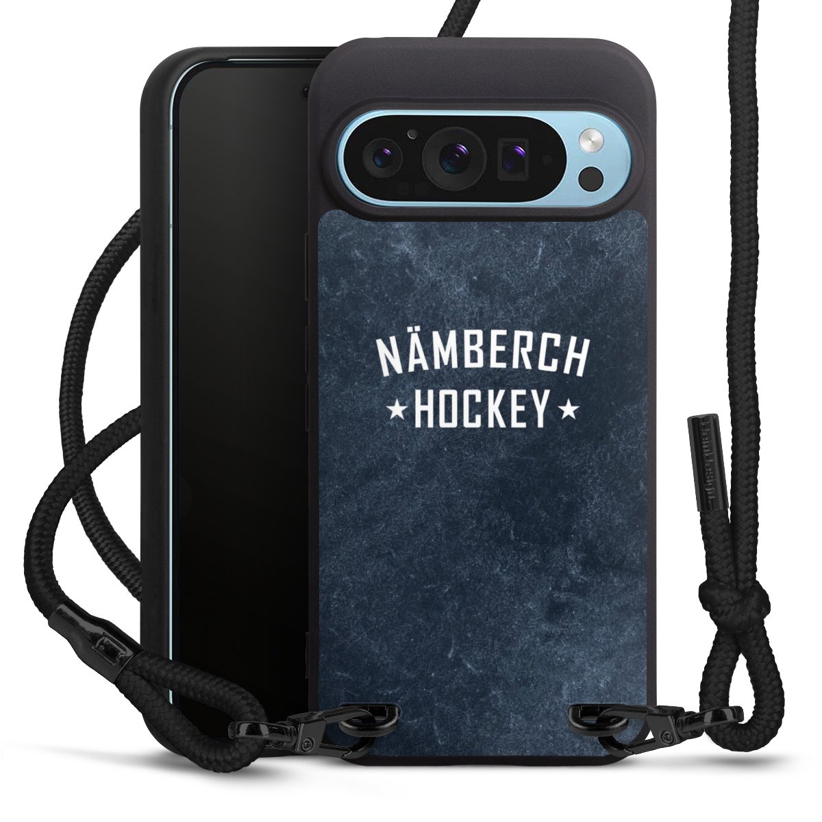 Pure Black: Handyhülle, Stoffband und Metalldetails in stylischem Mattschwarz.