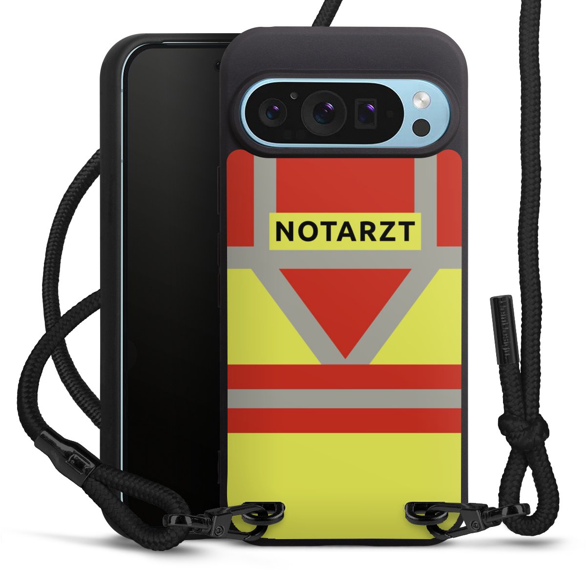 Pure Black: Handyhülle, Stoffband und Metalldetails in stylischem Mattschwarz.