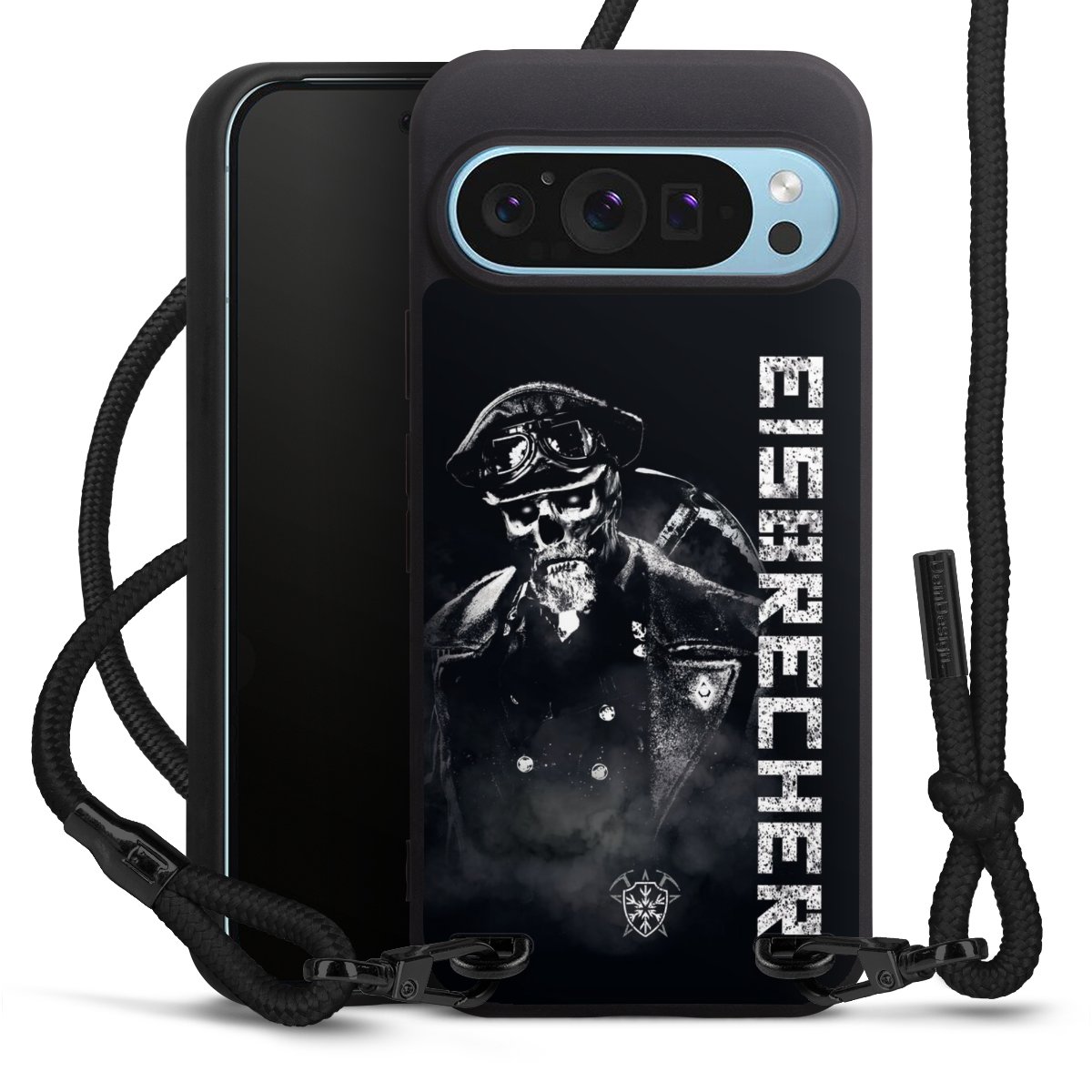 Pure Black: Handyhülle, Stoffband und Metalldetails in stylischem Mattschwarz.
