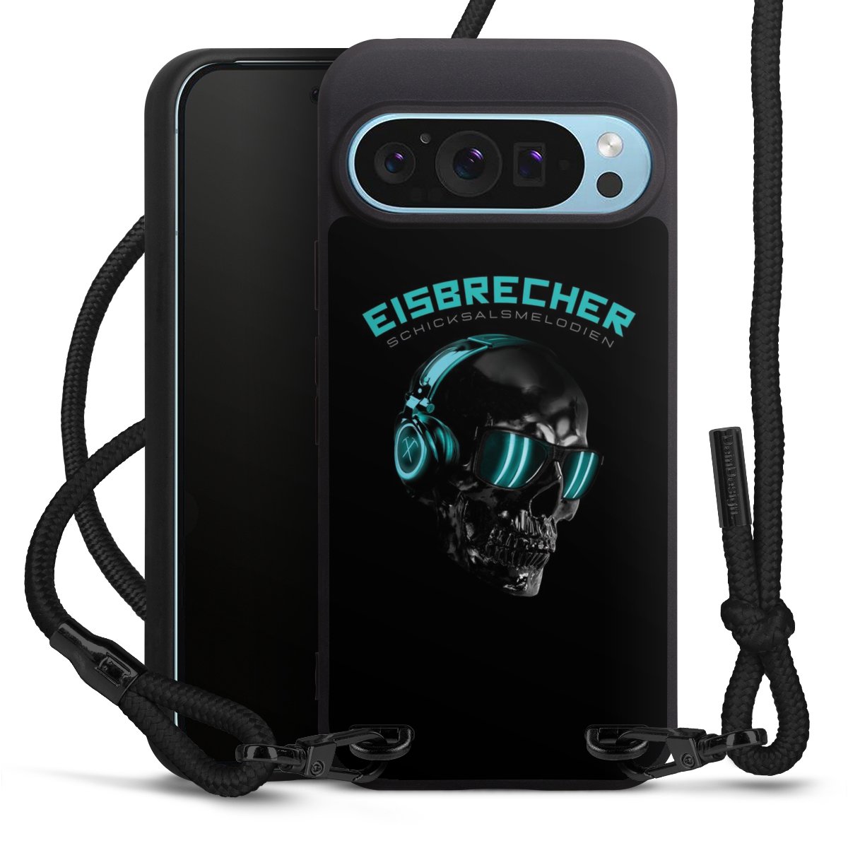 Pure Black: Handyhülle, Stoffband und Metalldetails in stylischem Mattschwarz.