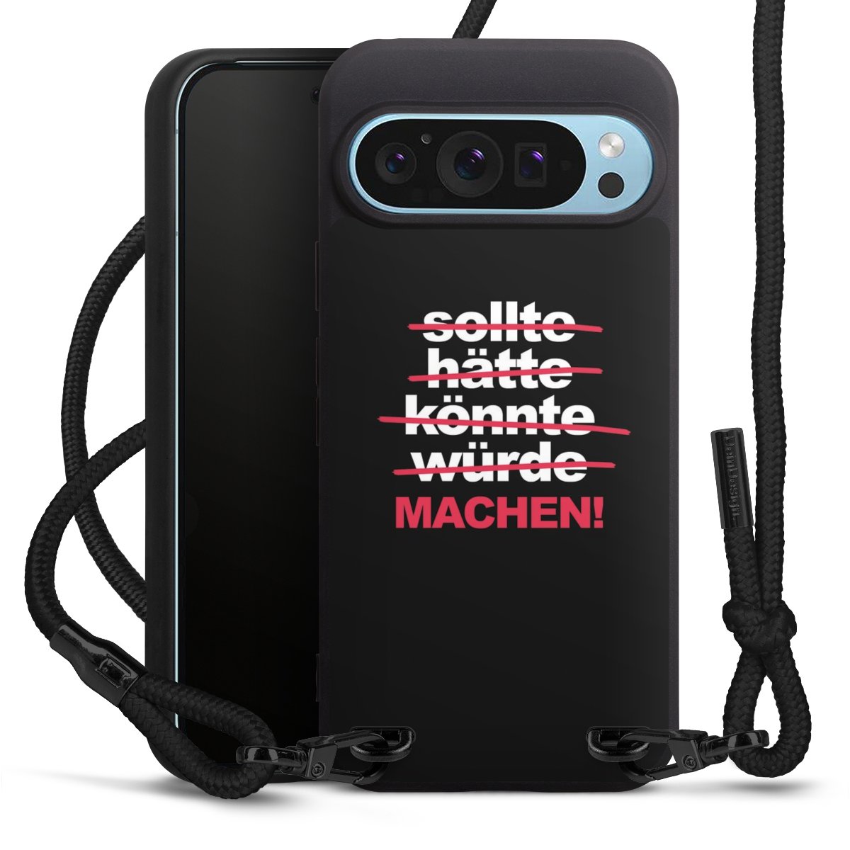 Pure Black: Handyhülle, Stoffband und Metalldetails in stylischem Mattschwarz.