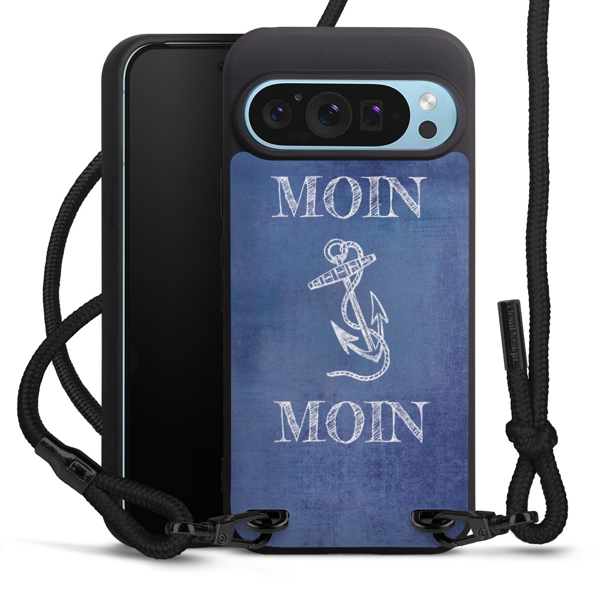 Pure Black: Handyhülle, Stoffband und Metalldetails in stylischem Mattschwarz.