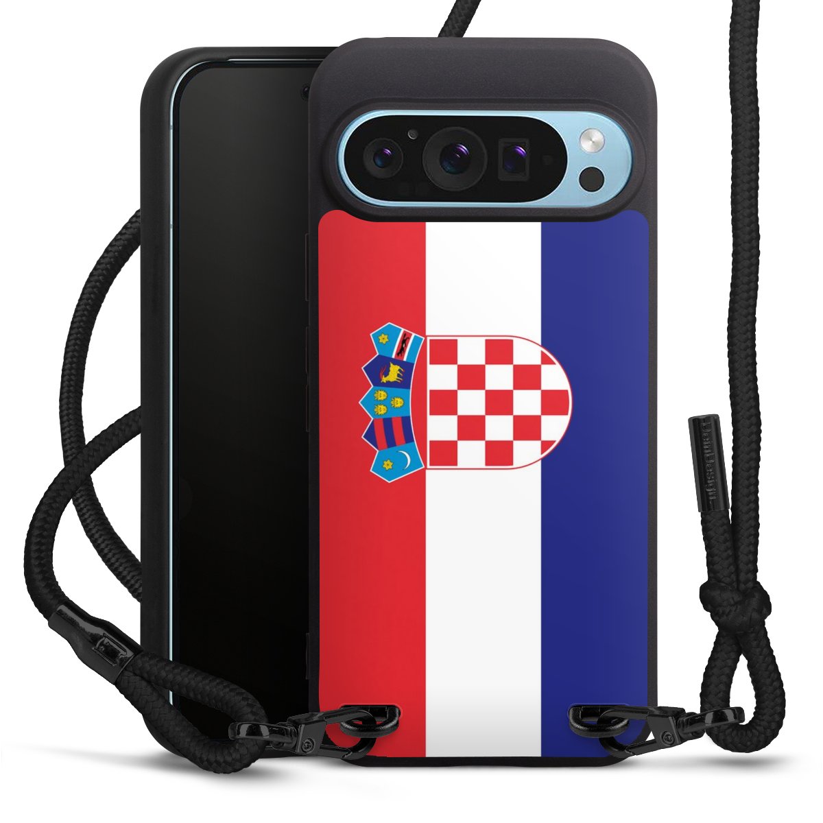 Pure Black: Handyhülle, Stoffband und Metalldetails in stylischem Mattschwarz.