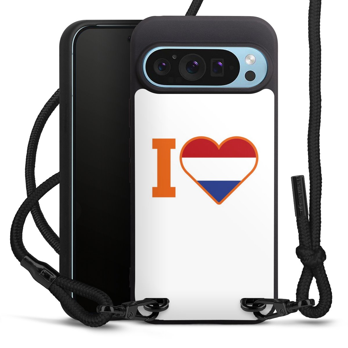 Pure Black: Handyhülle, Stoffband und Metalldetails in stylischem Mattschwarz.