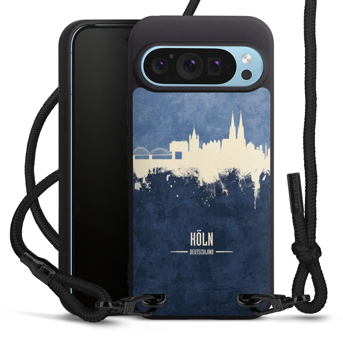 Pure Black: Handyhülle, Stoffband und Metalldetails in stylischem Mattschwarz.