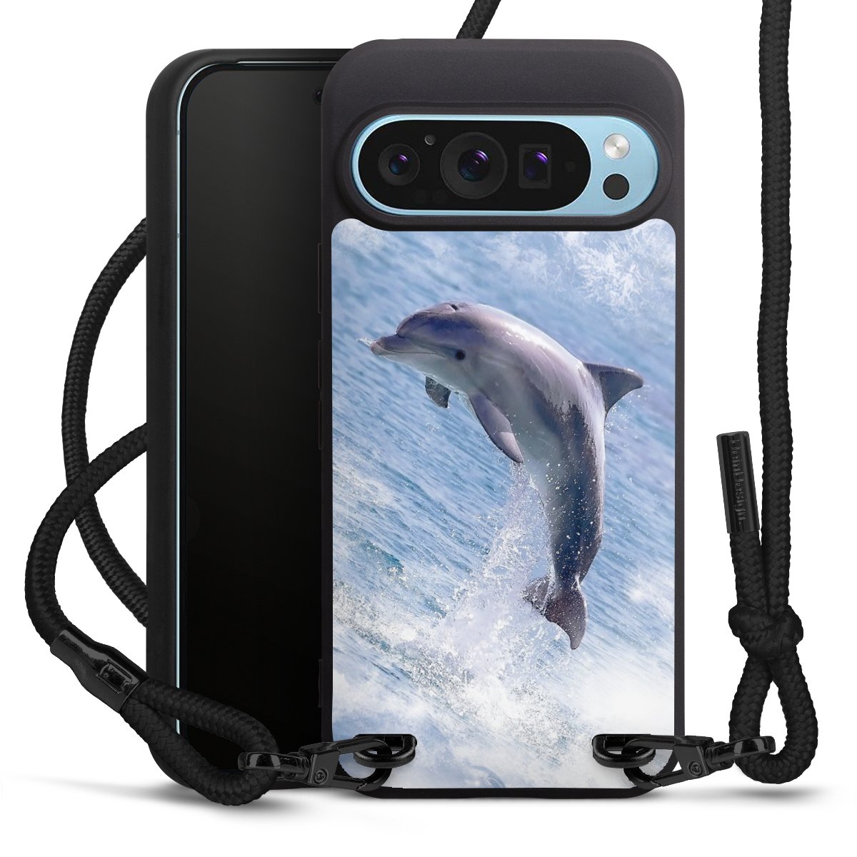 Pure Black: Handyhülle, Stoffband und Metalldetails in stylischem Mattschwarz.