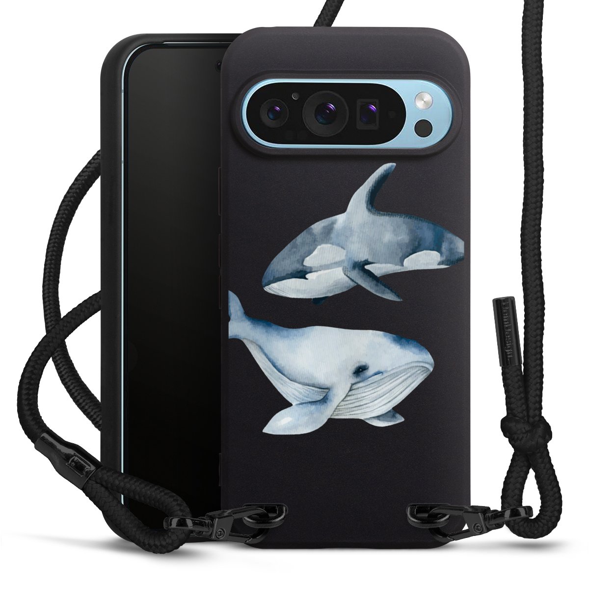 Pure Black: Handyhülle, Stoffband und Metalldetails in stylischem Mattschwarz.