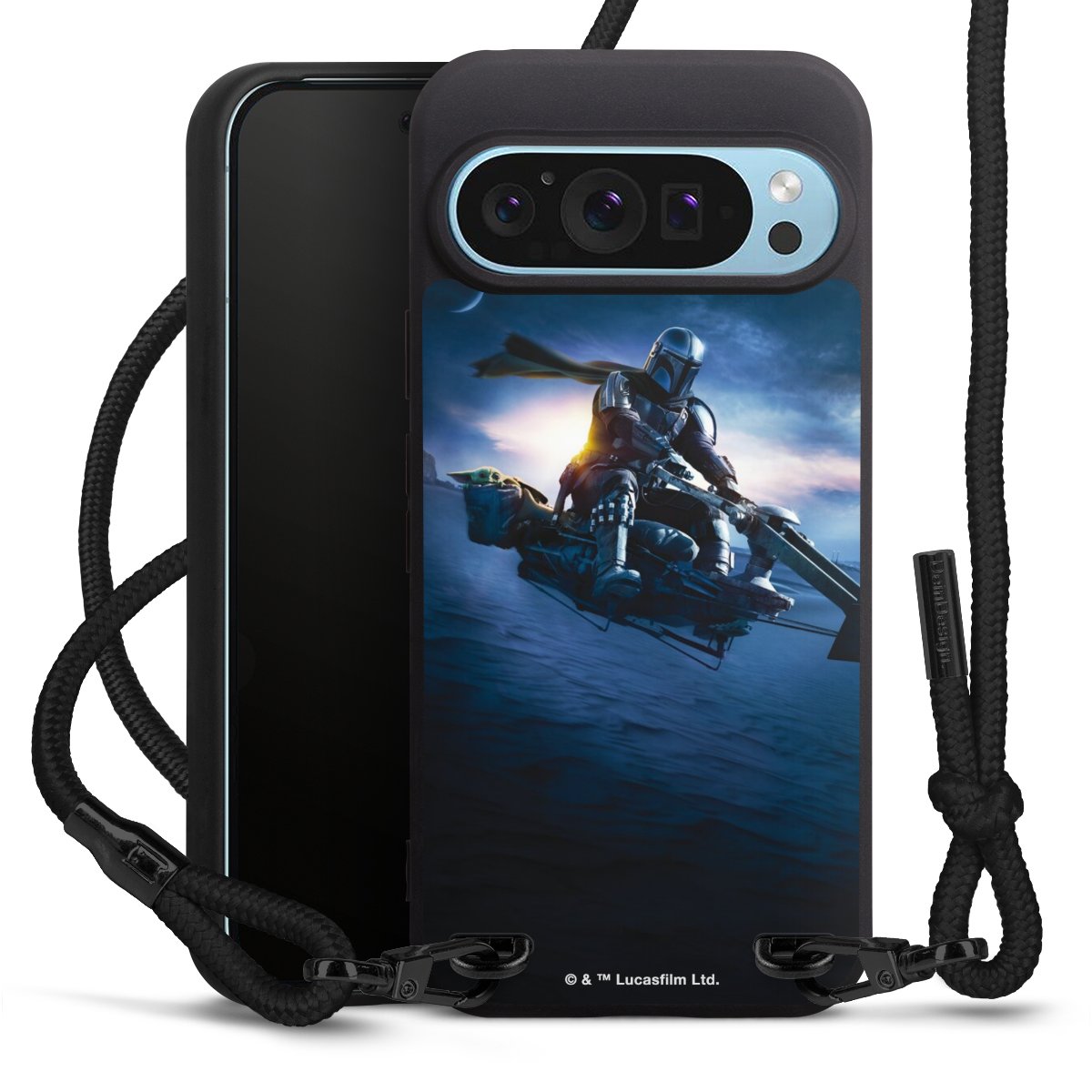 Pure Black: Handyhülle, Stoffband und Metalldetails in stylischem Mattschwarz.