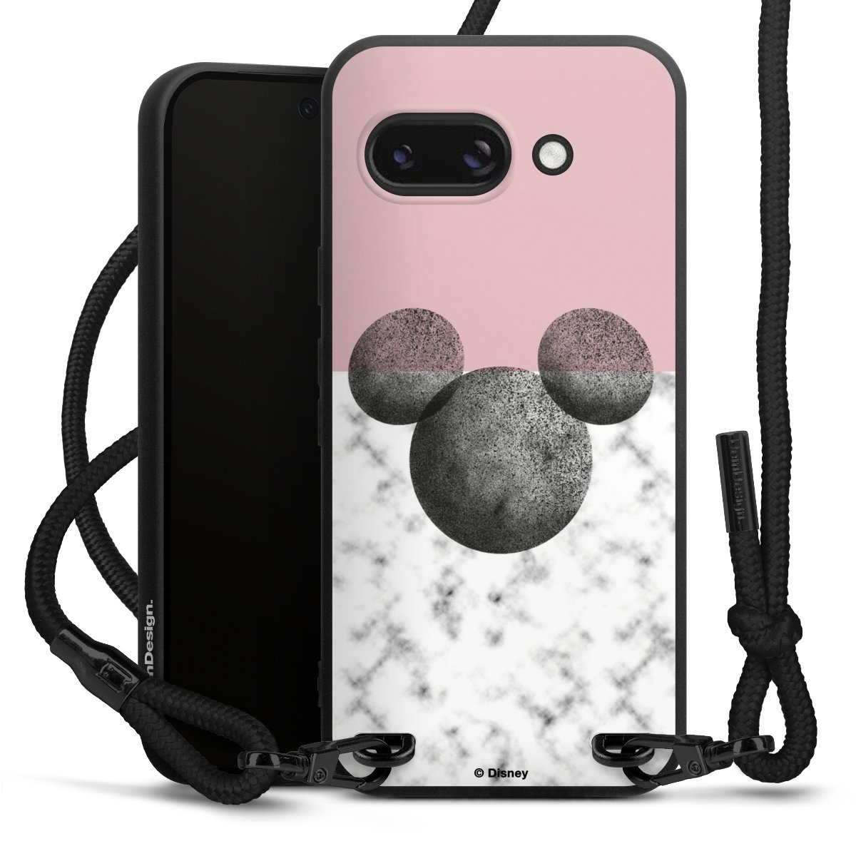 Pure Black: Handyhülle, Stoffband und Metalldetails in stylischem Mattschwarz.