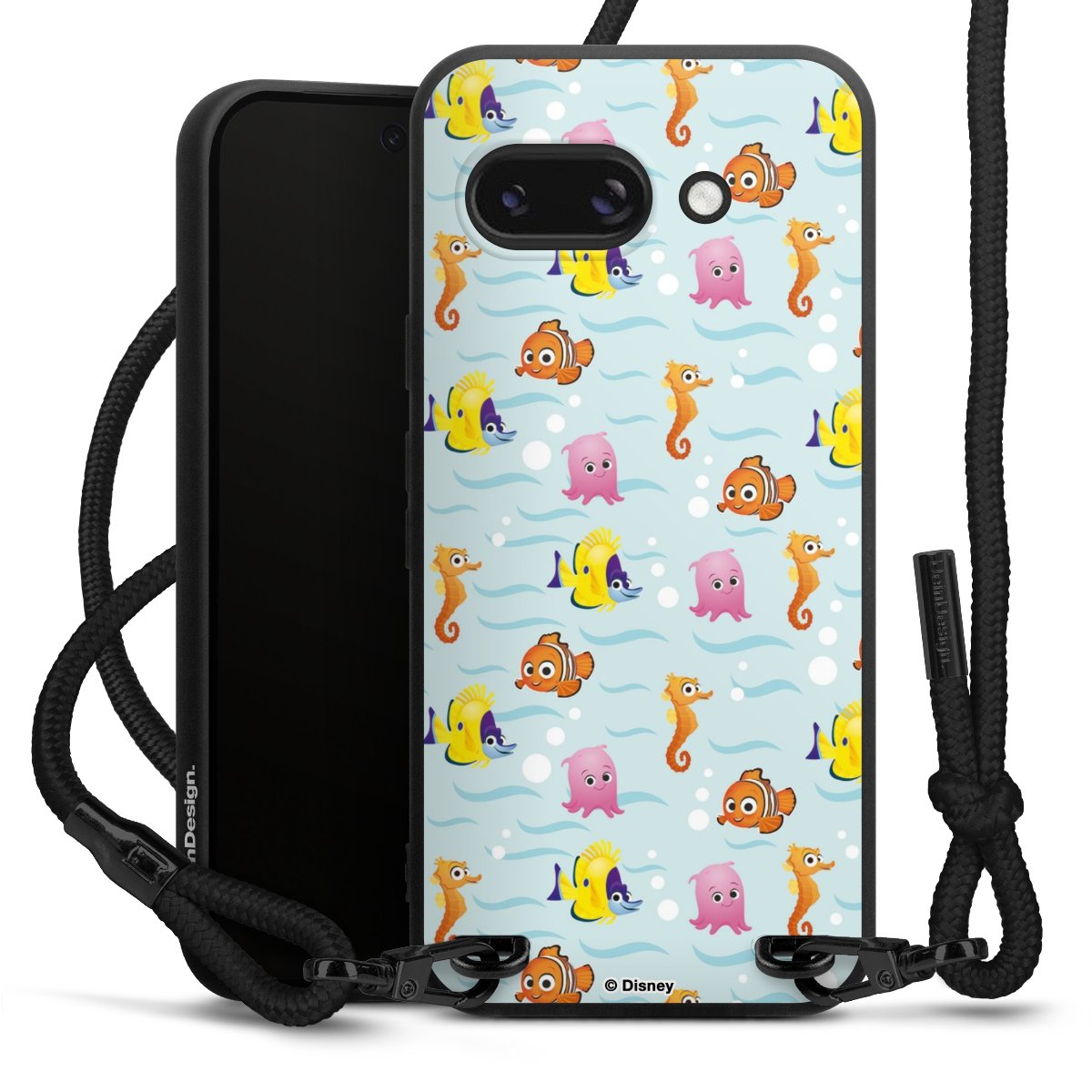 Pure Black: Handyhülle, Stoffband und Metalldetails in stylischem Mattschwarz.