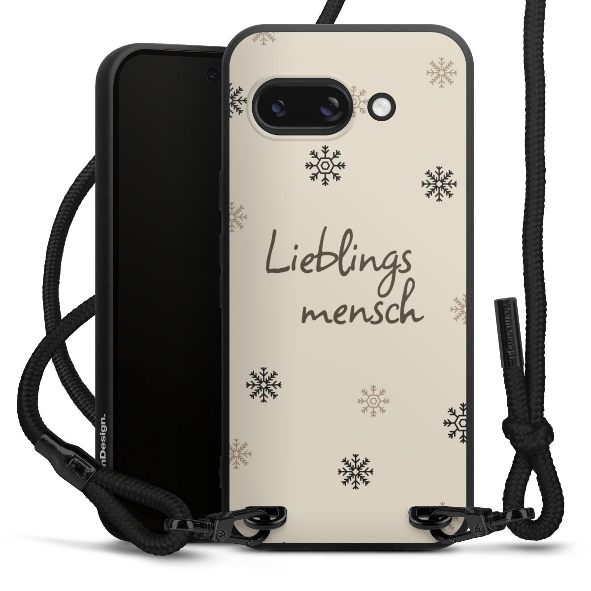 Pure Black: Handyhülle, Stoffband und Metalldetails in stylischem Mattschwarz.