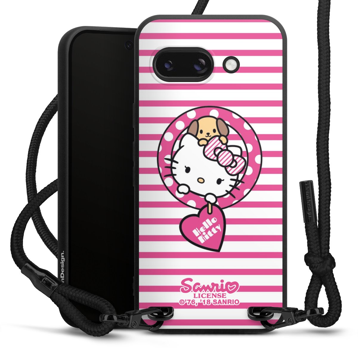Pure Black: Handyhülle, Stoffband und Metalldetails in stylischem Mattschwarz.