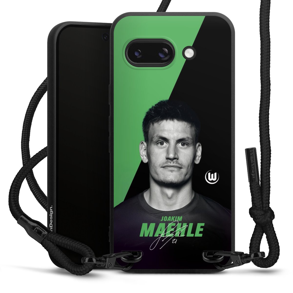 Pure Black: Handyhülle, Stoffband und Metalldetails in stylischem Mattschwarz.