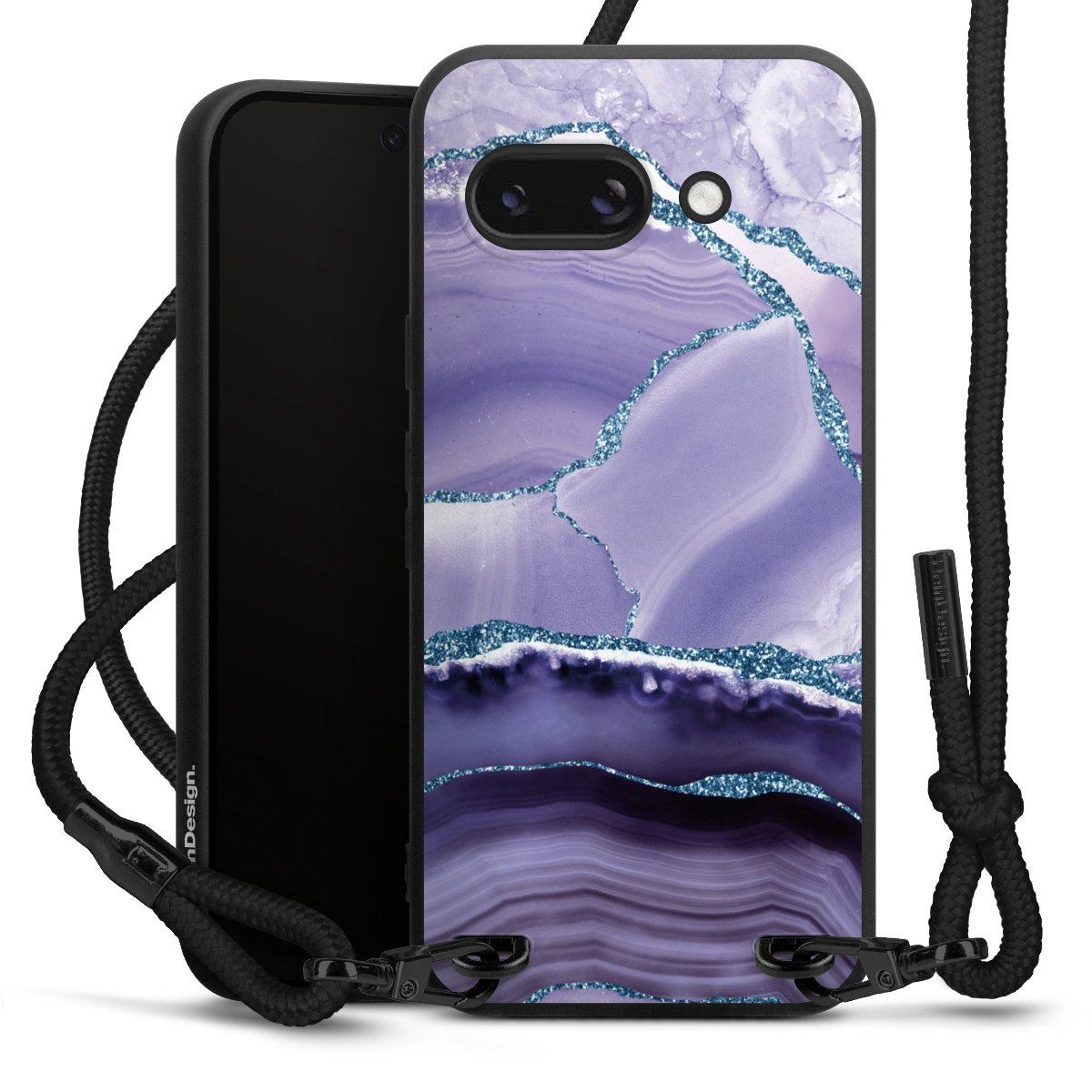 Pure Black: Handyhülle, Stoffband und Metalldetails in stylischem Mattschwarz.