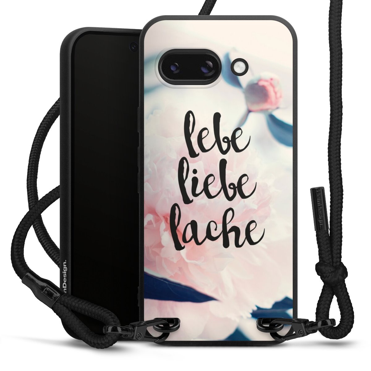 Pure Black: Handyhülle, Stoffband und Metalldetails in stylischem Mattschwarz.