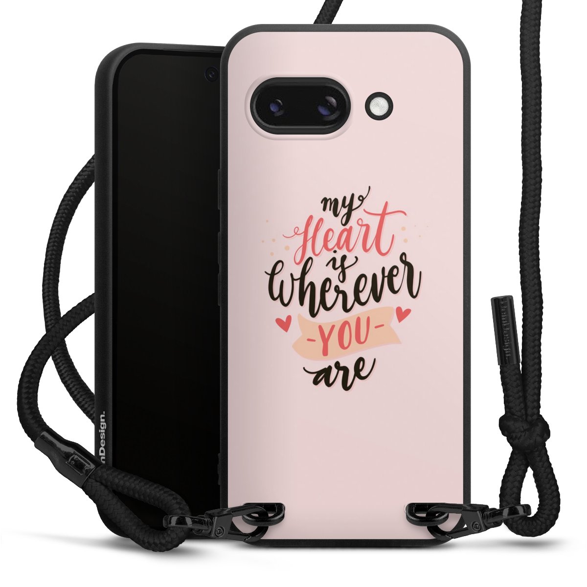 Pure Black: Handyhülle, Stoffband und Metalldetails in stylischem Mattschwarz.