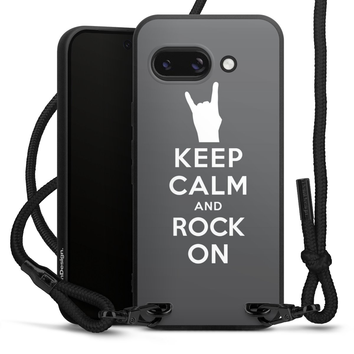 Pure Black: Handyhülle, Stoffband und Metalldetails in stylischem Mattschwarz.